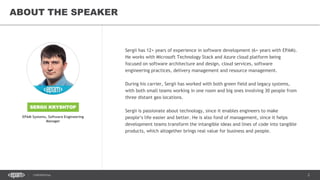 The document discusses microservices architecture, focusing on characteristics, infrastructure selection, and various Microsoft Azure services for hosting and deployment. It highlights the advantages and disadvantages of various services, such as Azure App Service, Azure Kubernetes Service, and Azure Service Fabric, addressing aspects like scalability, cost efficiency, and deployment practices. Additionally, it emphasizes the shift towards containerization and orchestration in modern cloud environments.