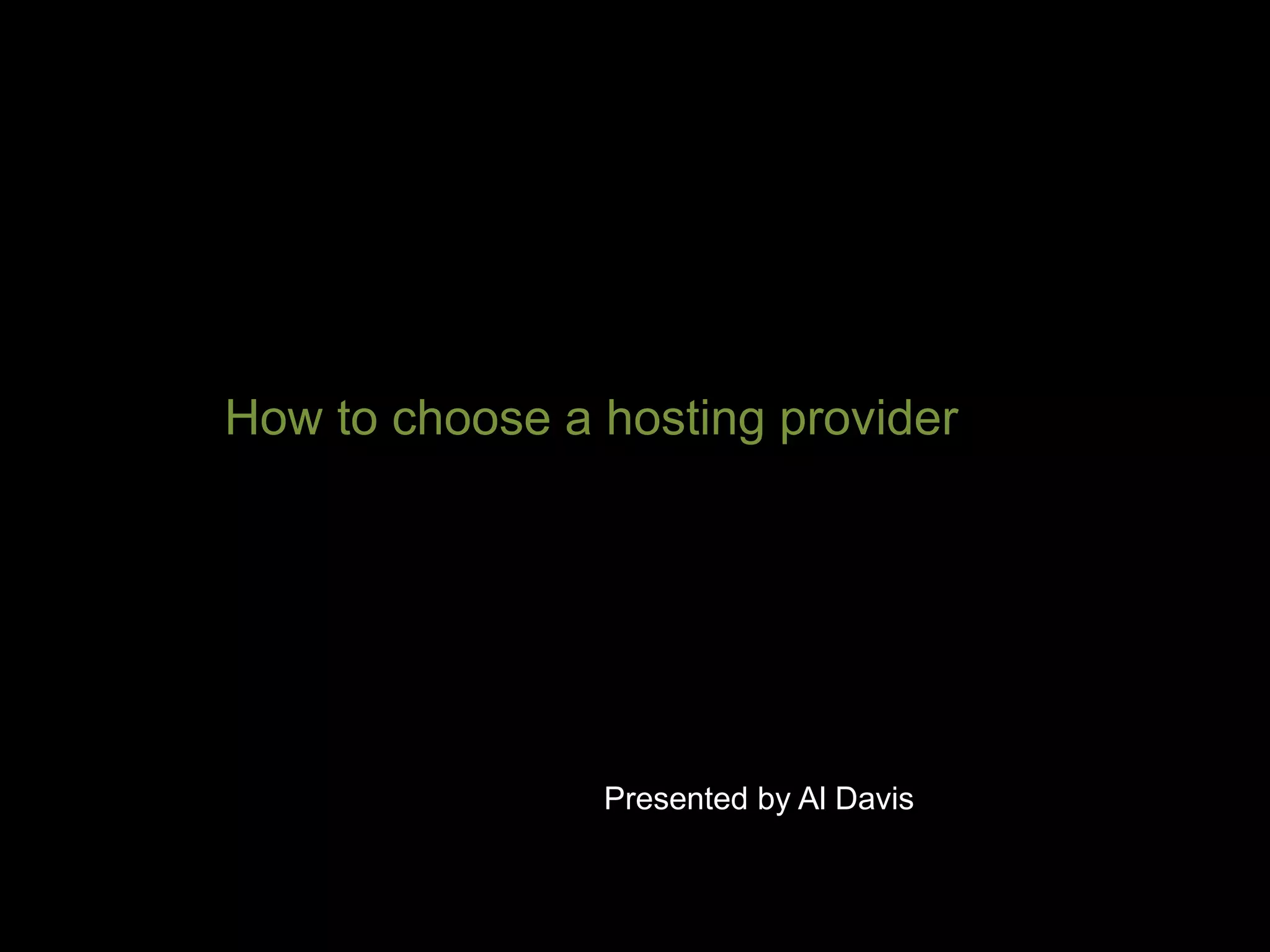 Shared hosting allows website owners to avoid the cost and technical expertise required to host a website themselves. When choosing a shared hosting provider, it is important to consider factors like storage limits, bandwidth allocation, support response times, and contract length. Overall, the quality of customer experience is the most important differentiator between hosting providers since their basic services are largely the same.
