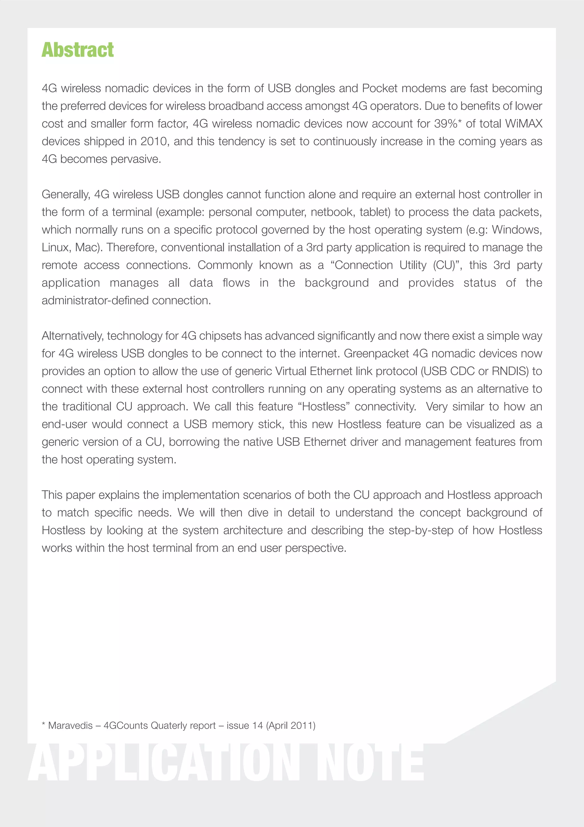 The document discusses the emergence and advantages of 4G wireless USB dongles, highlighting their growing adoption as preferred devices for broadband access. It introduces the concept of 'hostless' connectivity, which allows these devices to connect directly to host systems without the need for traditional connection utilities (CUs), simplifying installation and improving user experience. The paper further emphasizes the benefits of hostless technology for manufacturers and operators in terms of reduced development time, enhanced compatibility, and improved accessibility for end-users.