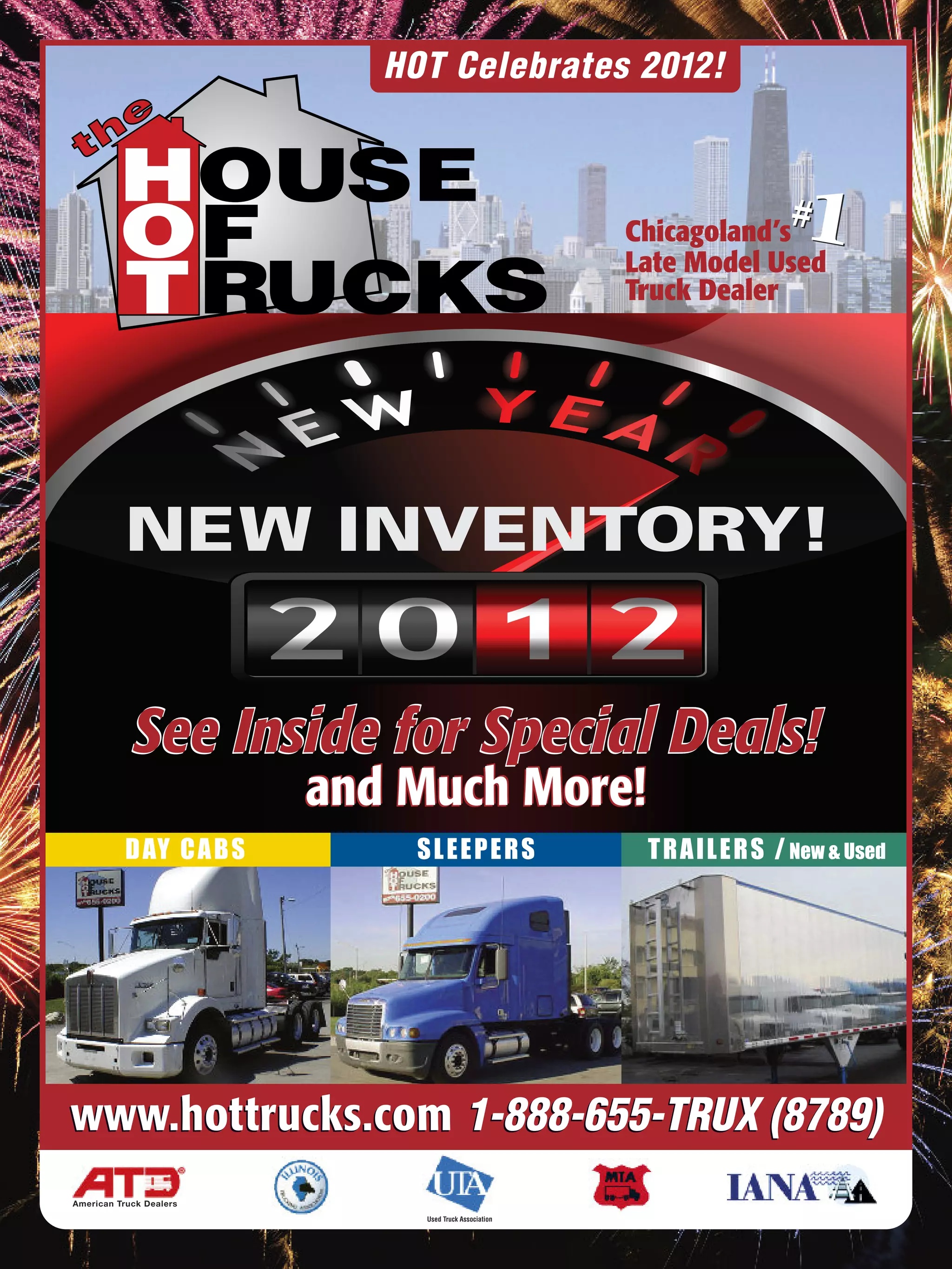 House of Trucks, a leading used truck dealer in Chicagoland, is celebrating its 2012 inventory with special offers on matched and inspected trucks and trailers. They provide financing options and trade-in deals for customers looking to buy or sell. Various used models, including day cabs and sleepers from renowned brands, are available with detailed specifications and competitive pricing.