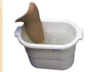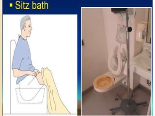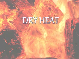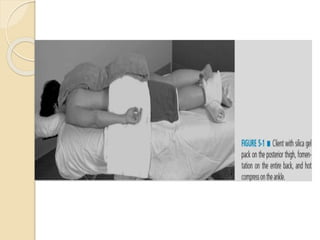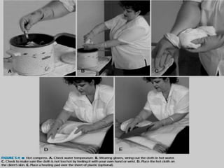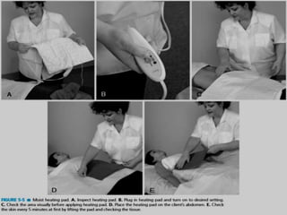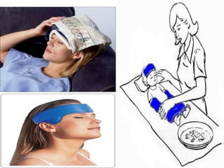 The document discusses the therapeutic uses and application procedures of local heat therapy, including various heating modalities like hot water bottles, heating pads, infrared lamps, and fomentations. It describes the physiological effects of heat in increasing circulation and metabolism, as well as indications and contraindications for different heat therapies. Precautions are outlined to prevent complications like burns during local heat applications.