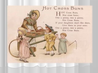 Traditional English food eaten on Good Friday includes hot cross buns, a spiced bun with raisins inside and a white cross on top. According to a legend, a monk who used to be a baker helped the poor and hungry after Easter by baking lots of hot cross buns to give to people still piping hot. It became a tradition to sing a song and give out hot cross buns on Easter Day.
