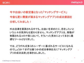 今や出会いの新定番となった「マッチングサービス」 今後も更に需要が高まるマッチングアプリの成功要因を分析してみました! 外出自粛を要請される中でも、出会いを求めたり、恋をしたいという人々の気持ちは変わりません。マッチングアプリは、移動が制限されるコロナ禍において、そういった男女にとってまさに最適なツールとなりました。 では、どうすれば多くのユーザーに喜ばれるサービスになれるのでしょうか?まずは幾つかの成功事例を元に「マッチングアプリの成功法則」を導き出しました。