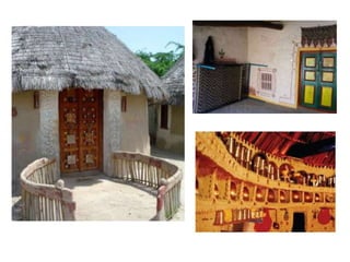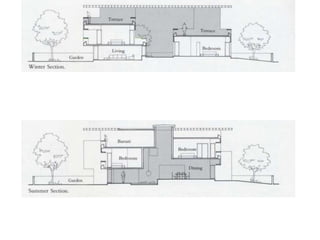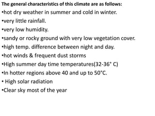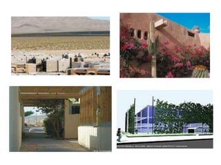 The document discusses various architectural strategies for hot and dry climates. It provides examples of traditional and vernacular architecture from different regions that effectively address the climate through passive design. Some key strategies mentioned include using thick, insulated walls; limiting window openings; orienting buildings around central courtyards to promote cross ventilation; employing overhangs, pergolas and vegetation for shading; and designing roofs to slope towards courtyards to drain heat. Case studies examined include the traditional Bungha house from India and the modern Parekh House designed by Charles Correa.
