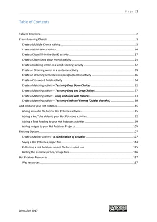 This document provides instructions for creating various activity types using the Hot Potatoes software, including multiple choice, multi-select, cloze, ordering, and matching activities. It includes steps for adding images and instructions, customizing the interface, saving project files, and publishing activities for student use. Sample text is provided on the last page for testing the different activity types.