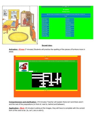 This unit plan outlines three lessons to teach students about rooms, furniture, and prepositions of place. The first lesson reviews prepositions and teaches vocabulary with flashcards and exercises. The second lesson teaches "there isn't/aren't" and more prepositions through a quiz. Students arrange images and sentences. The third lesson reviews forms of "to be" through an activity and teaches interrogative forms. Students place images in a room and answer questions about the placement. Each lesson includes activation, comprehension, application, and reflection activities to reinforce the target language.