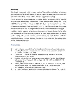 Hot rolling is a process that modifies the cross-section and reduces the thickness of metal plates. It uses two support rolls to bear loads and prevent bending, and two work rolls in direct contact with the plate to apply force. The rolls must operate at temperatures higher than the metal's recrystallization point, ranging from 1100 to 1300°C, and cool the metal to 50°C at the end of the process. In addition to withstanding high temperatures and loads, the hot rolling rolls are subjected to impact and bending forces. The final result is a product with greater ductility and finer grain structure due to heat transfer, friction, and radiation during rolling.