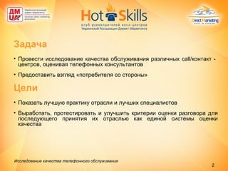 Документ представляет собой исследование качества телефонного обслуживания телекоммуникационных компаний, в котором оценивались телефонные консультанты на основе нескольких критериев, таких как базовые навыки, стиль общения и знание предметной области. В исследовании было проведено 36 звонков в разные компании, с целью выявить лучшие практики и стандарты обслуживания. В результате анализа были определены уровни сервиса каждой компании и предоставлены рекомендации для улучшения качества обслуживания.