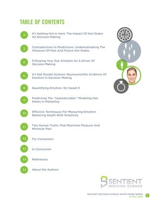 The white paper discusses 'hot-state' decision making, highlighting how emotional and visceral responses can influence consumer behavior in marketing contexts. It argues that emotions, often seen as irrational, significantly shape decisions and can lead consumers to act impulsively against long-term interests, such as when hunger drives unhealthy purchases. Understanding these dynamics allows marketers to harness short-term emotional triggers to optimize both immediate sales and long-term customer relationships.