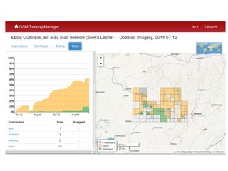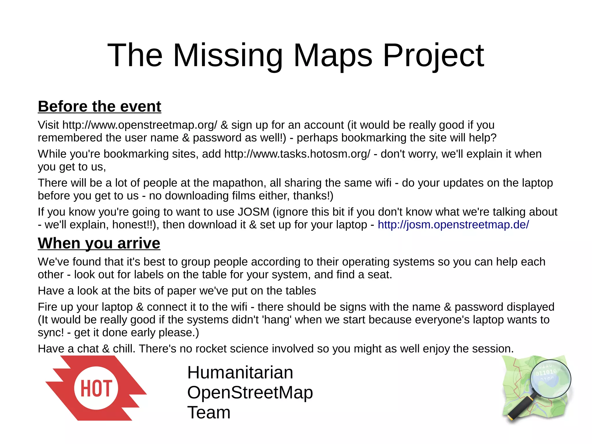 The document provides instructions for attending a mapathon event to contribute to OpenStreetMap. It recommends setting up an OSM account and bookmarking the tasking manager website in advance. Upon arrival, participants should connect their laptops to wifi and download any needed mapping software before the event starts. The tasking manager is then explained as a way to find and work on mapping projects, with color-coded statuses to identify tasks that are complete, in progress, or need fixing.