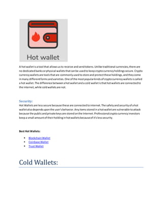 This document compares hot and cold cryptocurrency wallets. Hot wallets are connected to the internet and allow sending and receiving tokens but are less secure since private keys are stored online and vulnerable to hacking. Cold wallets have no internet connection, storing private keys offline for enhanced security, making them suitable for long-term investors. The best cold wallets are Ledger Nano X, Ledger Nano S, and Trezor T due to their security features like offline private key storage and confirmation buttons.