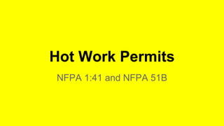 Hot work permits are necessary for various activities like welding and grinding, especially in non-permissible areas or near combustible materials. Responsibilities include ensuring equipment safety, maintaining fire protection equipment, and conducting area assessments before and during hot work operations. The permit process involves site inspection, completing the permit, and retaining documentation throughout the work period.