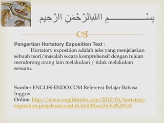 The document defines and provides examples of a hortatory exposition text. A hortatory exposition aims to persuade the reader to take or avoid a certain action. It typically includes a thesis stating the main idea, arguments supporting the thesis with emotive language, and a recommendation inviting the reader to act. Two examples are provided, one about corruption and one addressing concerns between country and city drivers regarding lead in petrol.