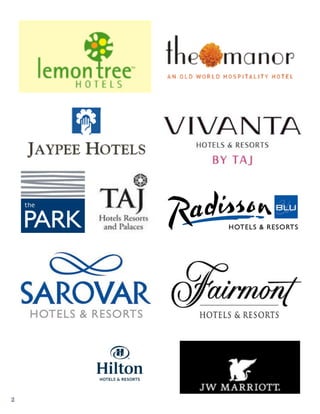 This document lists over 80 hotel and hospitality projects that the company has worked on. It includes projects providing furnishings, fabrics, linens, and other items. Some of the major hotel brands and projects mentioned include the Oberoi Hotels, ITC Hotels, Taj Hotels, JW Marriott, Radisson Hotels, and various other luxury hotels and resorts across India.