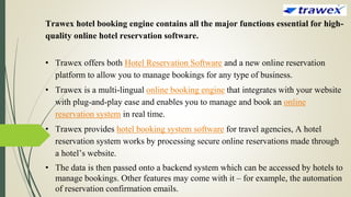 Trawex offers a comprehensive hotel booking software that includes online reservation systems, payment gateways, and management tools for hotels and travel agencies. This multi-lingual, cloud-based platform enhances operational efficiency by automating bookings and managing inventory across various sales channels. The software is designed for easy integration with existing websites, promoting direct bookings and providing a user-friendly experience across multiple devices.