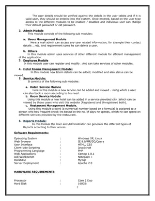 This document outlines the objectives and modules of a proposed hotel reservation system. The system aims to provide online reservation, cancellation, and administrative functions for customers, employees and administrators. It improves on an existing manual system by adding secure user registration and profile management, increased data security, and larger memory usage. The proposed system includes modules for authentication, administration, employee functions, hotel and room management, services, and report generation. It is designed for easy use through a rich interface and uses classes to manage user and product data. The system will be developed using PHP for the programming language and MySQL for the database.