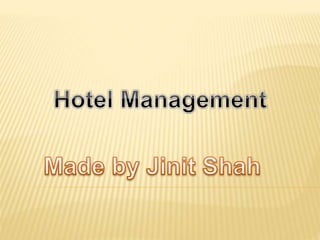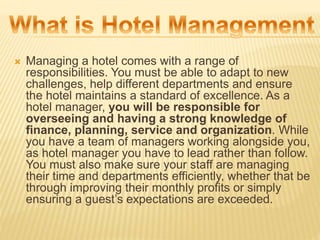 This document provides information about pursuing a career in hotel management through various educational programs and roles. It discusses the responsibilities of a hotel manager in overseeing all aspects of hotel operations. Different levels of qualifications are outlined, such as certificate, diploma, and degree programs that typically range from 6 months to 3 years. Starting salaries for hotel management graduates in various countries and for different roles in India are provided. Key skills needed for hotel management like communication, leadership, and flexibility are also highlighted.