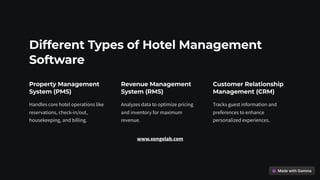 Hotel management software is a digital system that helps hospitality businesses manage operations like booking, guest services, and accounting efficiently. It includes various systems such as property management, revenue management, and customer relationship management to enhance guest experiences and optimize revenue. The software development process involves discovery, design, development, and deployment phases, with ongoing support offered by companies like Xongolab.
