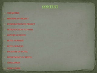 This document provides an overview of a hotel management system project. It discusses the motivation for the project which is to computerize the system to reduce paperwork. It then introduces the hotel industry, describing hotel services, facilities, and departments. Challenges in the hotel business such as market forces and labor are also reviewed. The conclusion emphasizes that computerization makes the system more reliable, efficient and fast compared to a manual system.