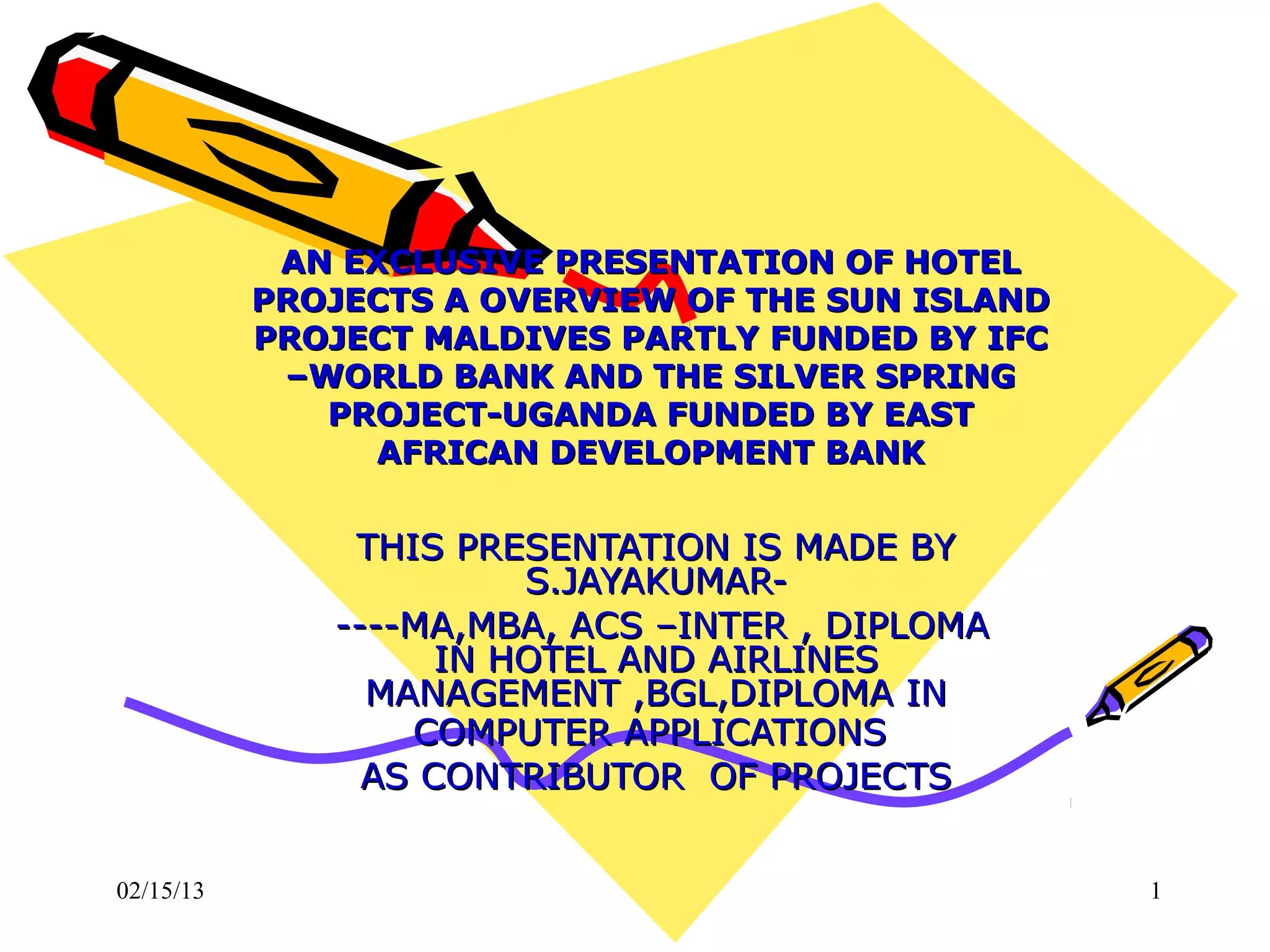 The document provides an overview of two hotel projects: the Sun Island project in the Maldives, partly funded by the IFC and World Bank, and the Silver Spring project in Uganda, funded by the East African Development Bank. It then discusses the presentation, which will be made by S. Jayakumar, and their qualifications. The rest of the document discusses various aspects of conceptualizing, planning, funding, implementing, and operating hotel projects.