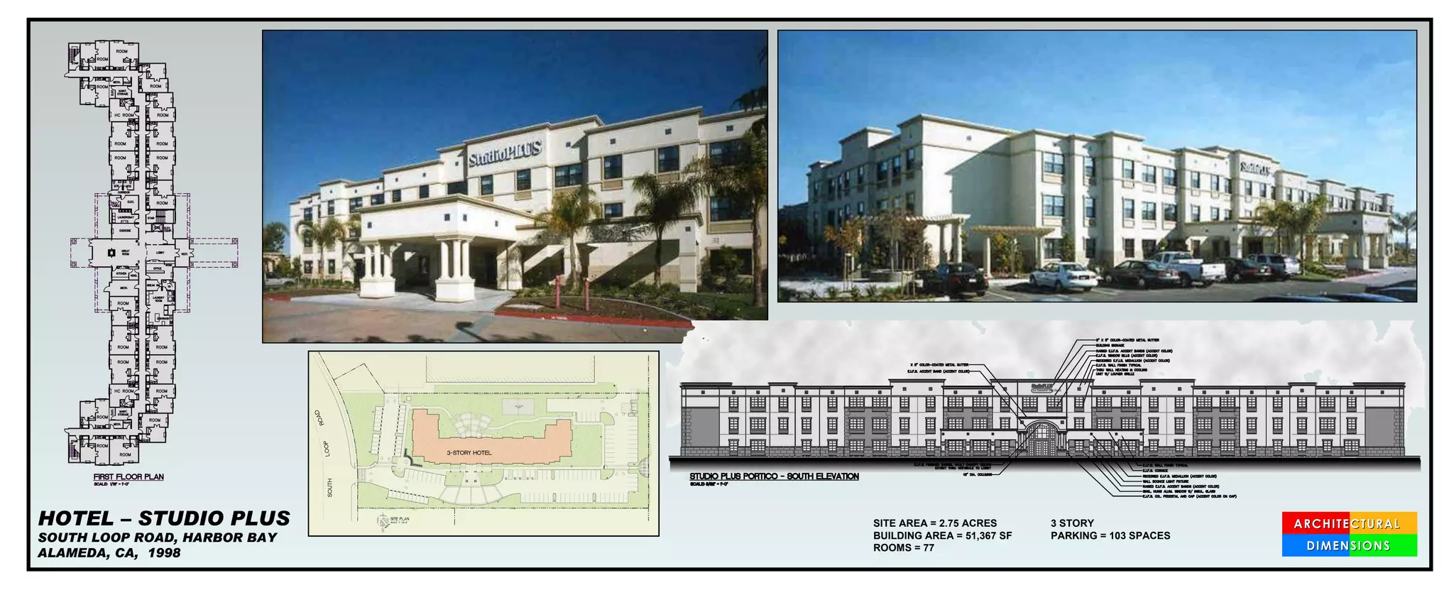 The document provides information on 8 hotel properties including the site area, building area, number of rooms, location, year built, number of stories, and parking spaces for each property. The properties range in size from 50,925 square feet to 174,153 square feet and were constructed between 1997 and 2009 in locations across California and Nevada.