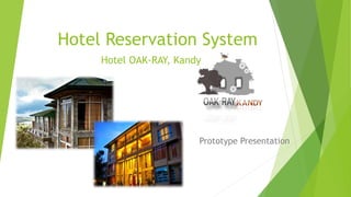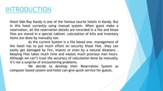This document presents a proposal for developing a computerized reservation system for Hotel Oak-Ray Kandy to replace their current manual system. The objectives are to save time, provide quick service for guests, and develop databases to store guest details. The current manual system requires significant effort for file security and storage. The proposed system will use a waterfall development methodology and include features like guest registration, room booking, and reservation confirmation online or by phone. It will follow design documentation practices like a context diagram, data flow diagram, use case diagram, ER diagram, and interface prototypes. The system requirements specify needed hardware, software, and security considerations.