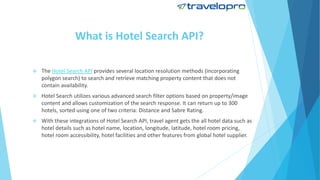 Travelopro offers a hotel search API that enables travel agents to access comprehensive hotel data, including location, pricing, and facilities, from global suppliers. The API allows for customized search responses and integrates seamlessly into travel booking platforms, improving customer experience and increasing booking rates. It supports various accommodations and provides real-time information, helping travel agencies streamline their operations and enhance their offerings.