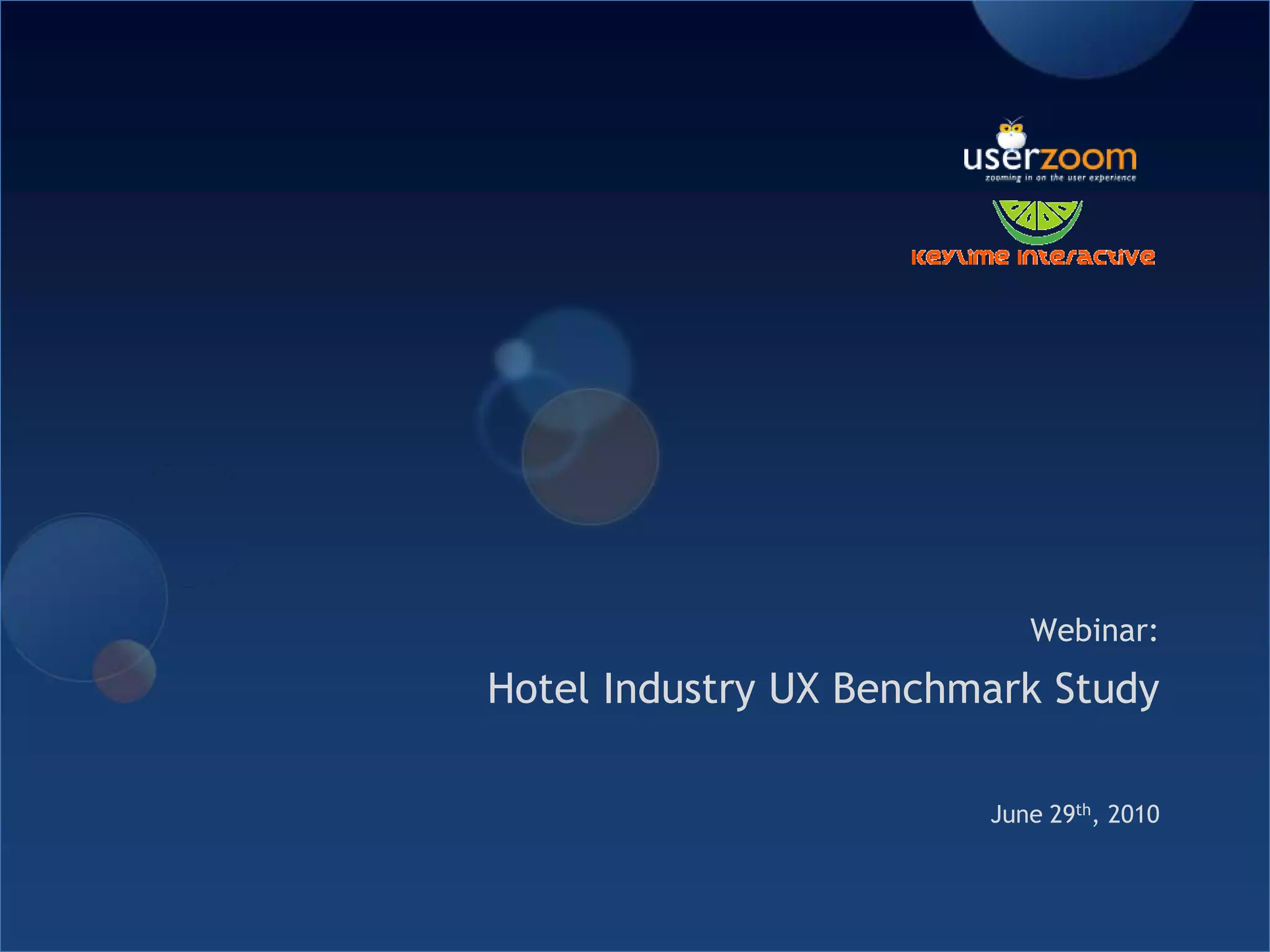 The webinar provided an executive summary of a hotel industry UX benchmark study conducted by UserZoom and Key Lime Interactive. Hilton and Marriott were the top two most popular hotel brands according to unaided responses. The study tested the online user experience of finding specific hotel information and booking rooms on Hilton, Marriott, Intercontinental, Sheraton, and Hyatt websites. While Hilton ranked highest on the UX score, all sites led to lower brand perception and net promoter scores after the tasks. Opportunities to improve the UX included providing more relevant rate, room style, and deals information upfront to better meet users' needs when booking travel.