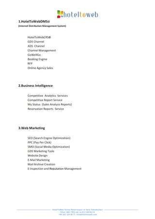 hoteltoweb© provides a comprehensive hotel management solution, offering tools for automated online sales, management, and analytics through a user-friendly central reservation system (CRS) that integrates with global distribution systems (GDS). It enhances hotel visibility on over 1600 travel portals and streamlines operations via a unified management panel. Additionally, it includes features for competitive price analysis, web marketing, and a secure online booking engine that adapts to user needs.