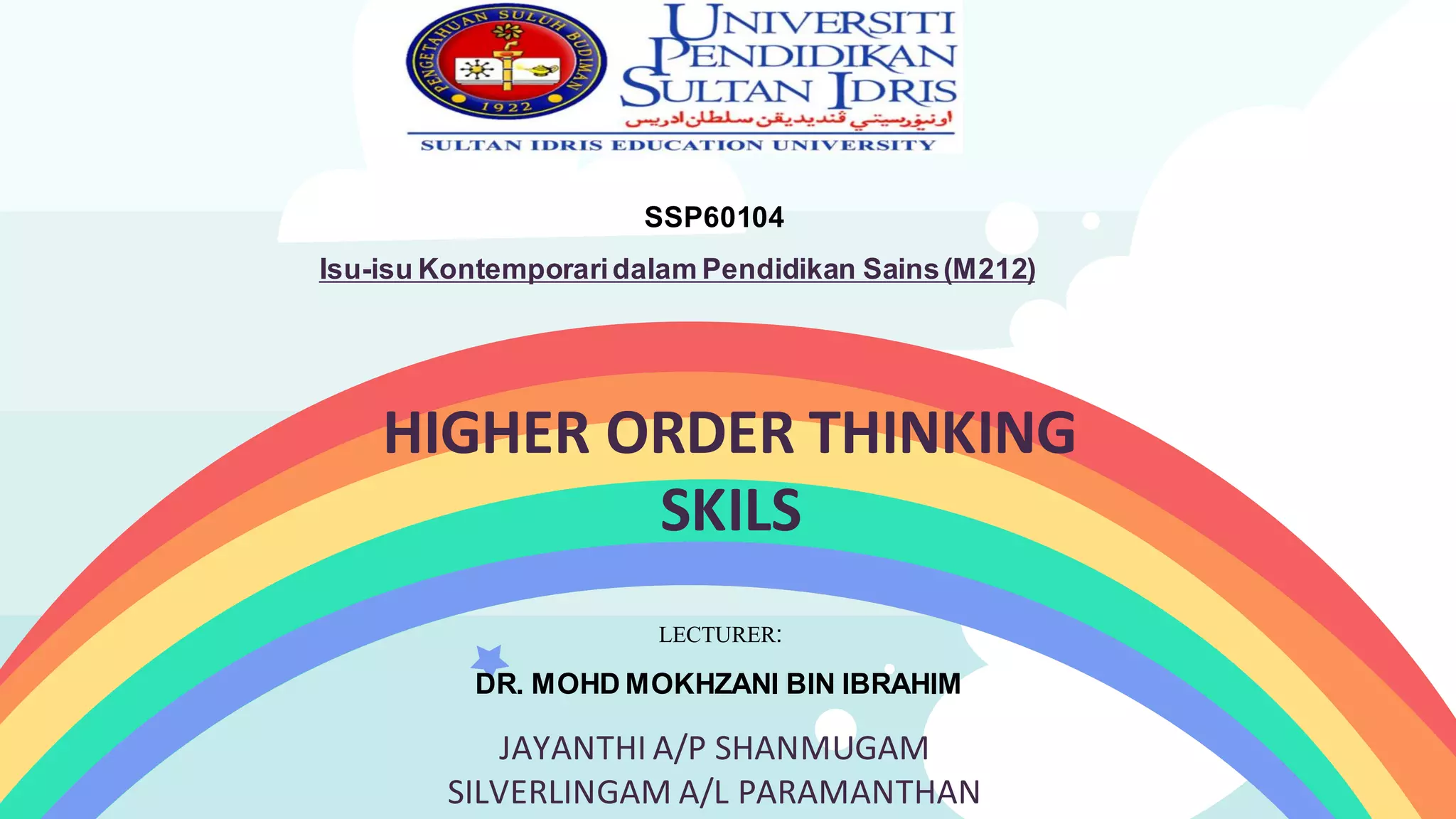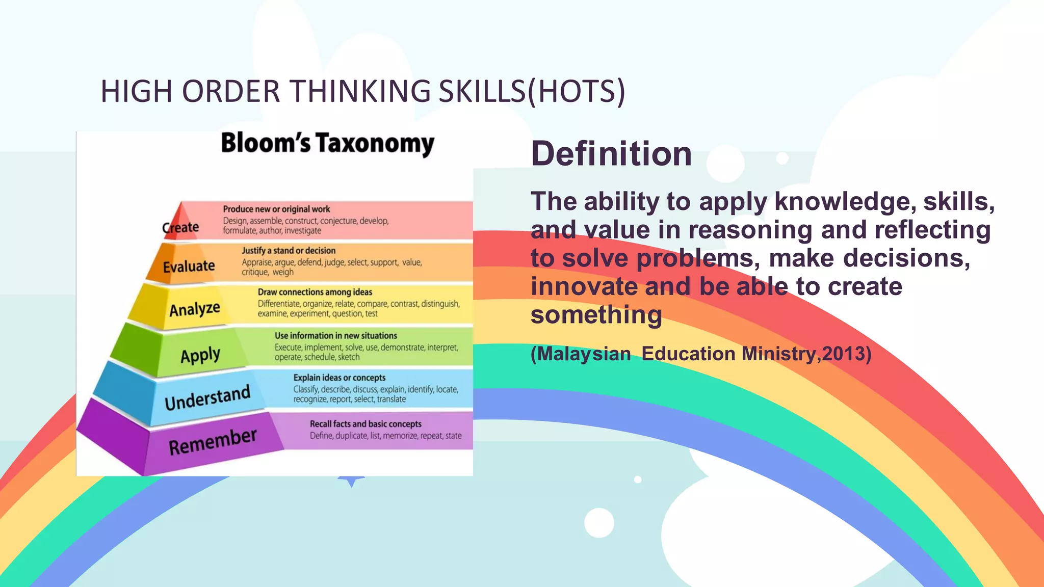 This document discusses higher order thinking skills (HOTS) in education. It defines HOTS as the ability to apply knowledge, skills, and values to solve problems, make decisions, innovate, and create. HOTS include skills like critical thinking, creative thinking, reasoning, and thinking strategies. The document outlines three important aspects of HOTS - applying knowledge, reasoning and reflecting, and problem solving and decision making. It also discusses verbs used to indicate different levels of HOTS. Finally, it discusses strategies for planning and implementing HOTS in pedagogy and some challenges, like time constraints and learning environments not conducive to active learning.