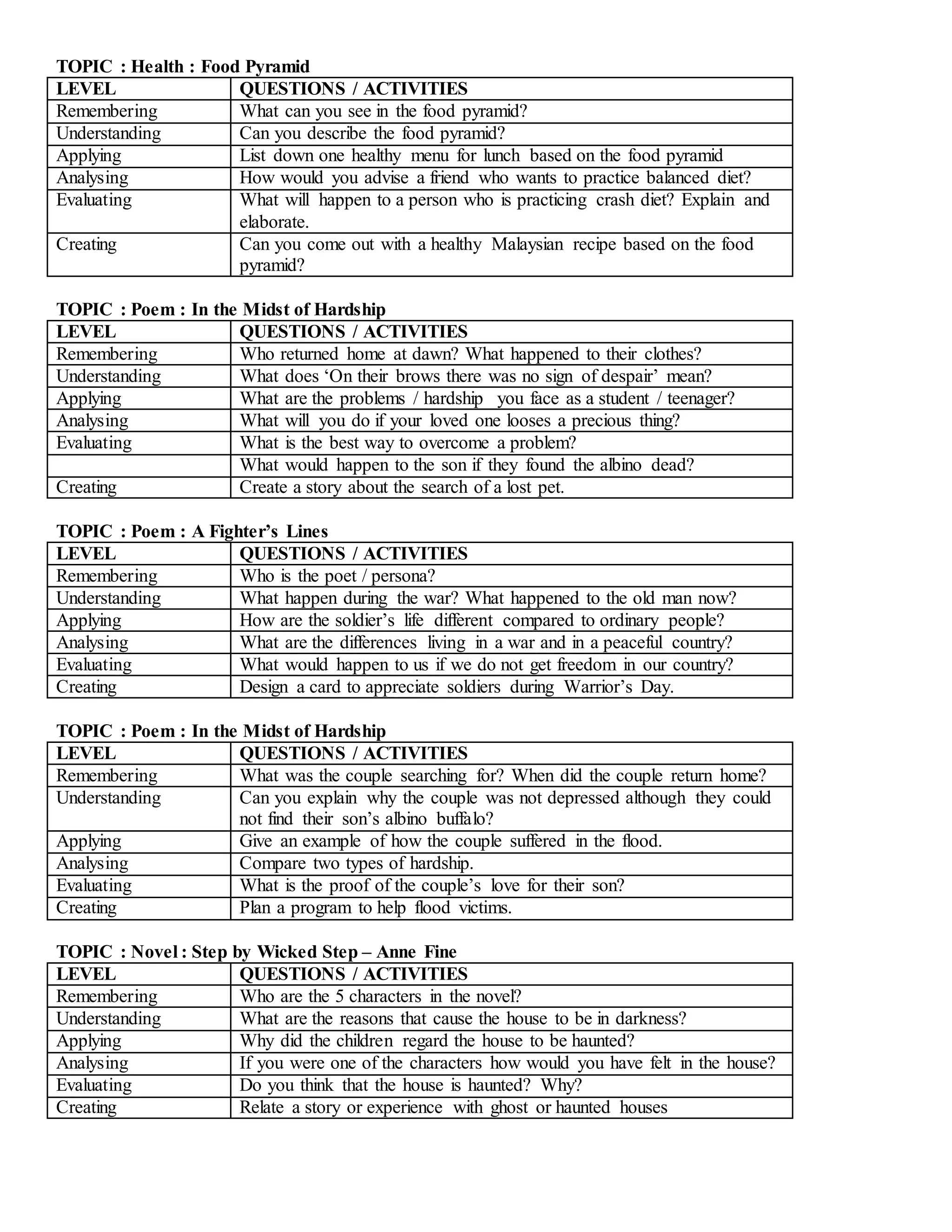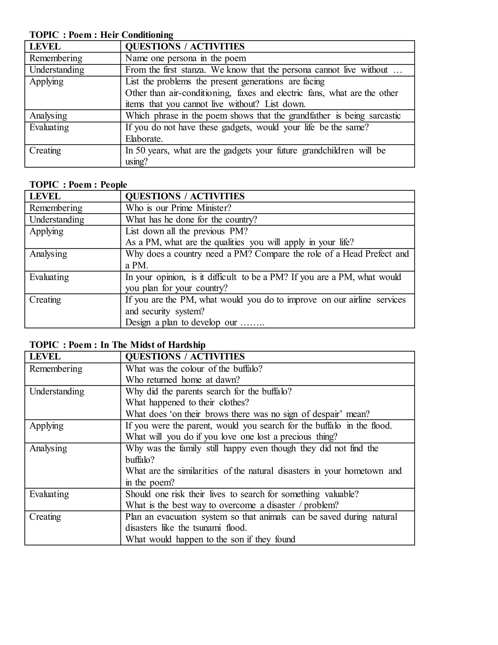 The document contains summaries of various poems, stories, and topics at different cognitive levels including remembering, understanding, applying, analyzing, evaluating, and creating. Questions provided for each topic assess different levels of understanding and ask students to recall information, explain concepts, list examples, compare ideas, make judgments, and generate new ideas related to the given prompts.