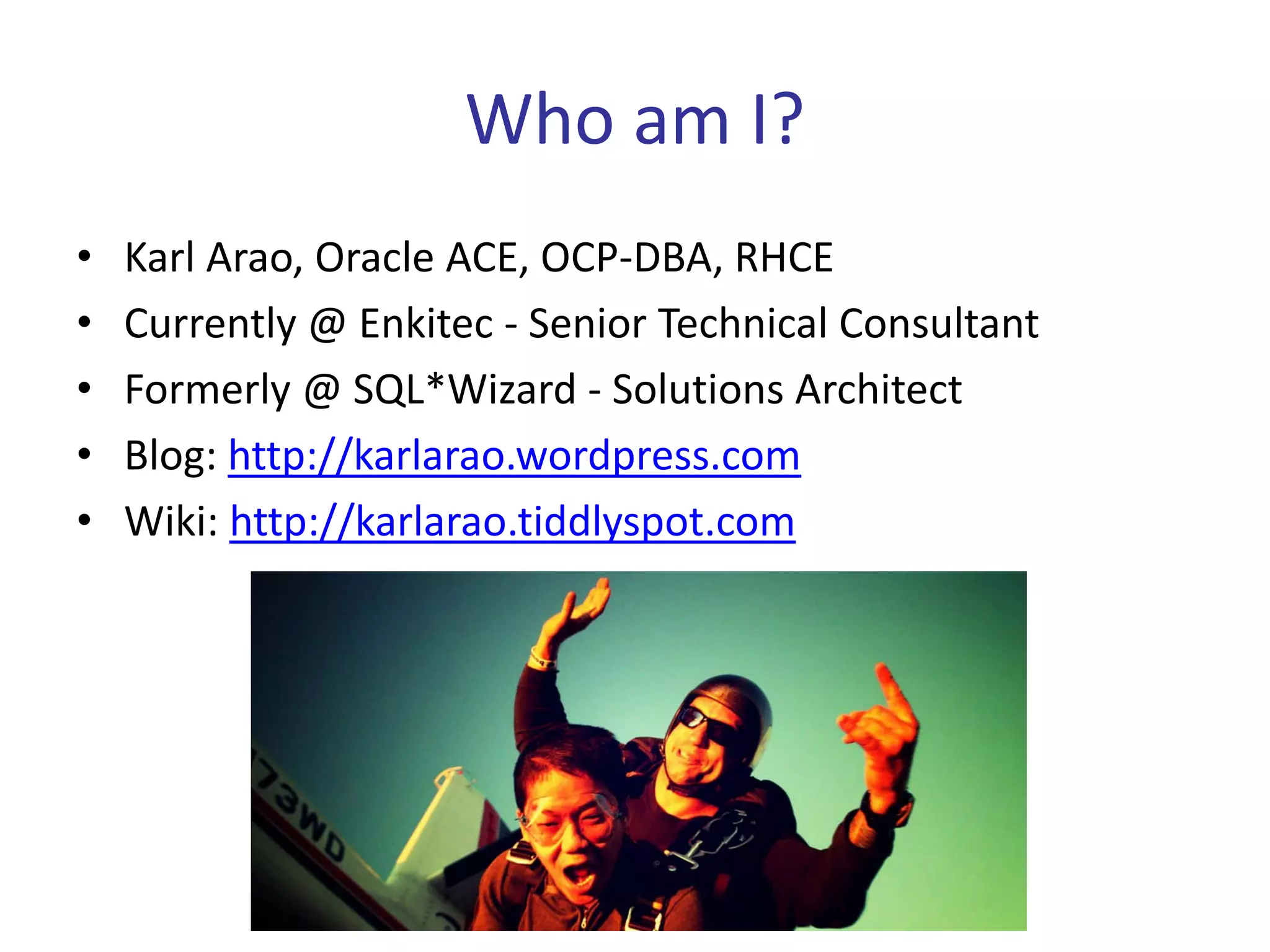 The document discusses mining the Automatic Workload Repository (AWR) in Oracle databases for capacity planning, visualization, and other real-world uses. It introduces Karl Arao as a speaker and discusses topics he will cover including AWR, diagnosing performance issues using AWR data, visualization of AWR data, capacity planning, and tools for working with AWR data like scripts and linear regression. References and resources on working with AWR are also provided.