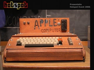 Introducing: www.hotspot.nl Hotspot.nl:>4 jaar oud initiatief om informatie- behoefte over draadloos te kanaliseren. Bericht over: Wi-Fi, ... Projecten Gadgets VoIP Mobile TV RFID