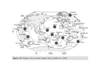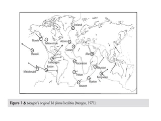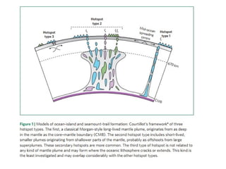 1) Hotspots are volcanic regions thought to be fed by anomalously hot mantle material rising independently of tectonic plate boundaries. Well-known examples include Hawaii, Iceland, and Yellowstone.