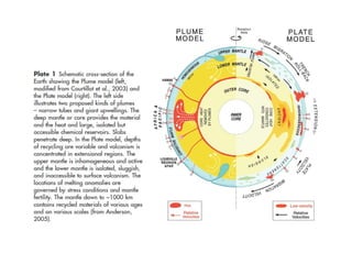 2) There are two hypotheses for the origin of hotspots - one involving mantle plumes rising from the core-mantle boundary, the other involving passive rising of melt from shallow depths.