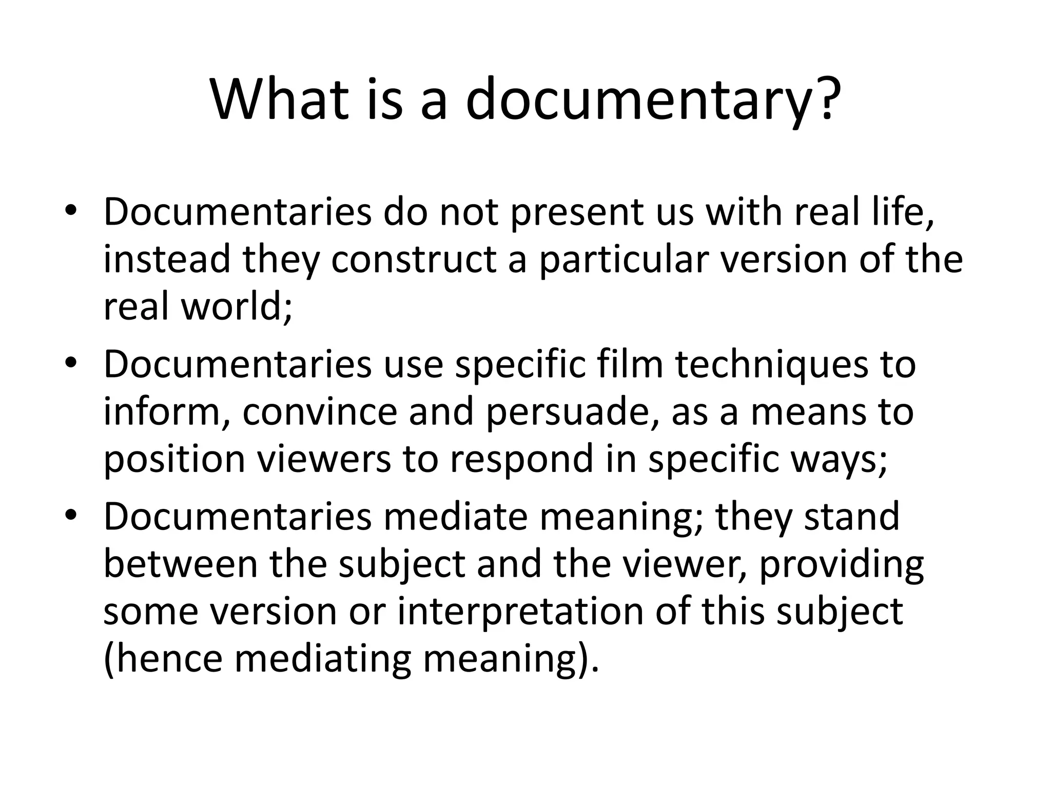Documentaries construct a particular version of reality through film techniques used to position viewers to respond in specific ways. They mediate meaning by providing an interpretation of the subject between the viewer. Documentaries aim to record, reveal, persuade, analyze or express while entertaining, educating, informing or persuading audiences. Viewers expect content to be grounded in the real world presented objectively. Documentaries can be categorized into expository, interactive, observational, and reflexive modes using forms like travel, diary, fly-on-the-wall, docu-soaps, and more to serve values like education, illumination, empathy, and social/political functions.
