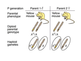 1) Lethal genes can be dominant or recessive, with recessive lethal alleles following a 2:1 genotypic to phenotypic ratio as seen in mouse coat color.
