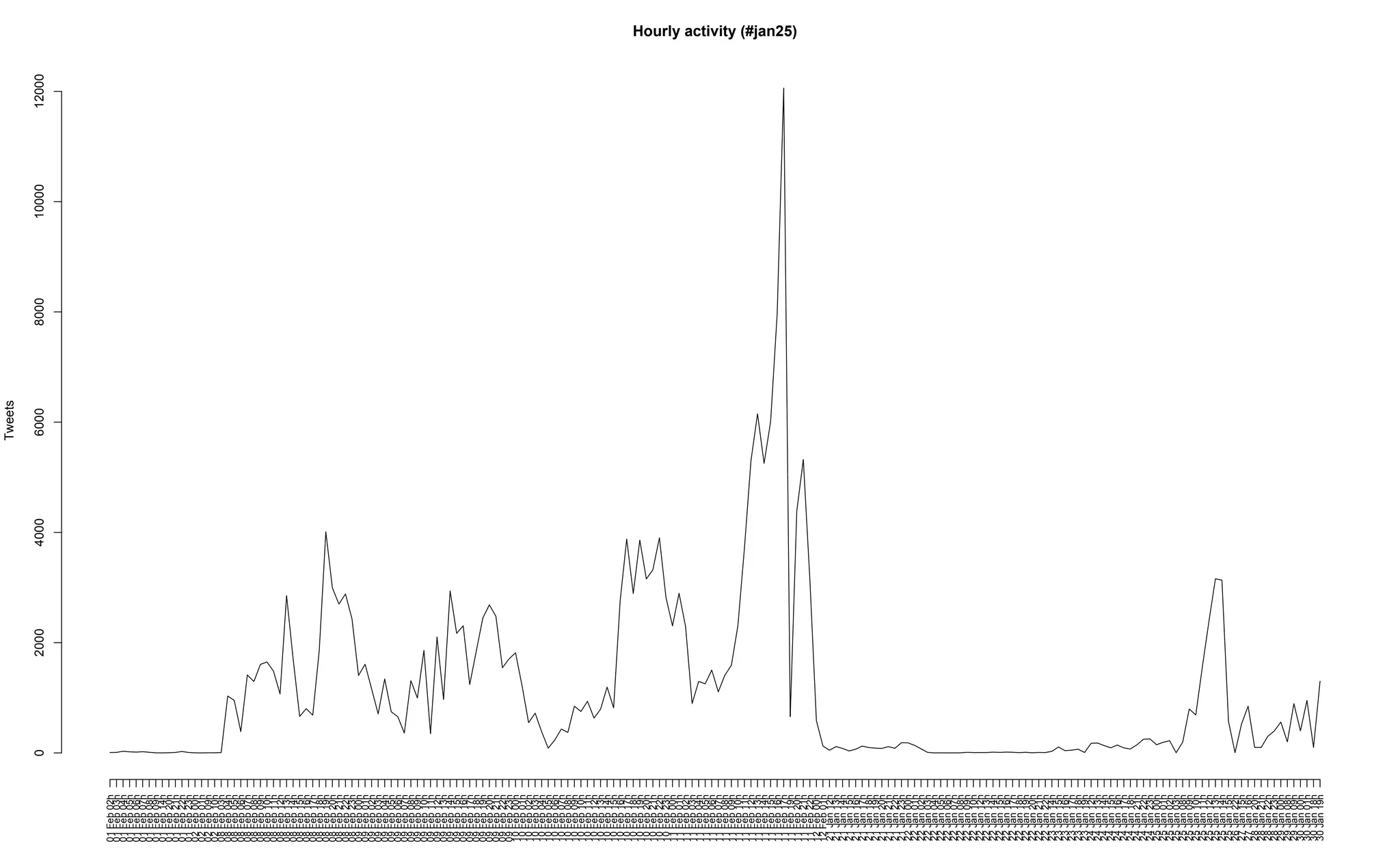 The document shows a line graph of the hourly number of tweets over a period of time, ranging from around 0 to 12,000 tweets per hour. The x-axis is labeled with dates from January 21st to February 12th, while the y-axis measures the number of tweets. There are peaks in tweet activity at various points, such as around January 25th which is labeled as "#jan25" on the graph.