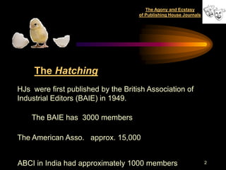 The document discusses the role and importance of house journals in organizations. It provides context on the origins of house journals in the UK and defines them as semi-official printed mediums of communication published by institutions and businesses. The document outlines the aims of house journals as informing, motivating, educating and entertaining employees while giving them an outlet for their literary skills. It discusses facets like sourcing material, the role of correspondents in gathering and making news, and importance of visuals, grammar and concise writing. The document emphasizes teamwork and obtaining feedback to continuously improve the house journal.