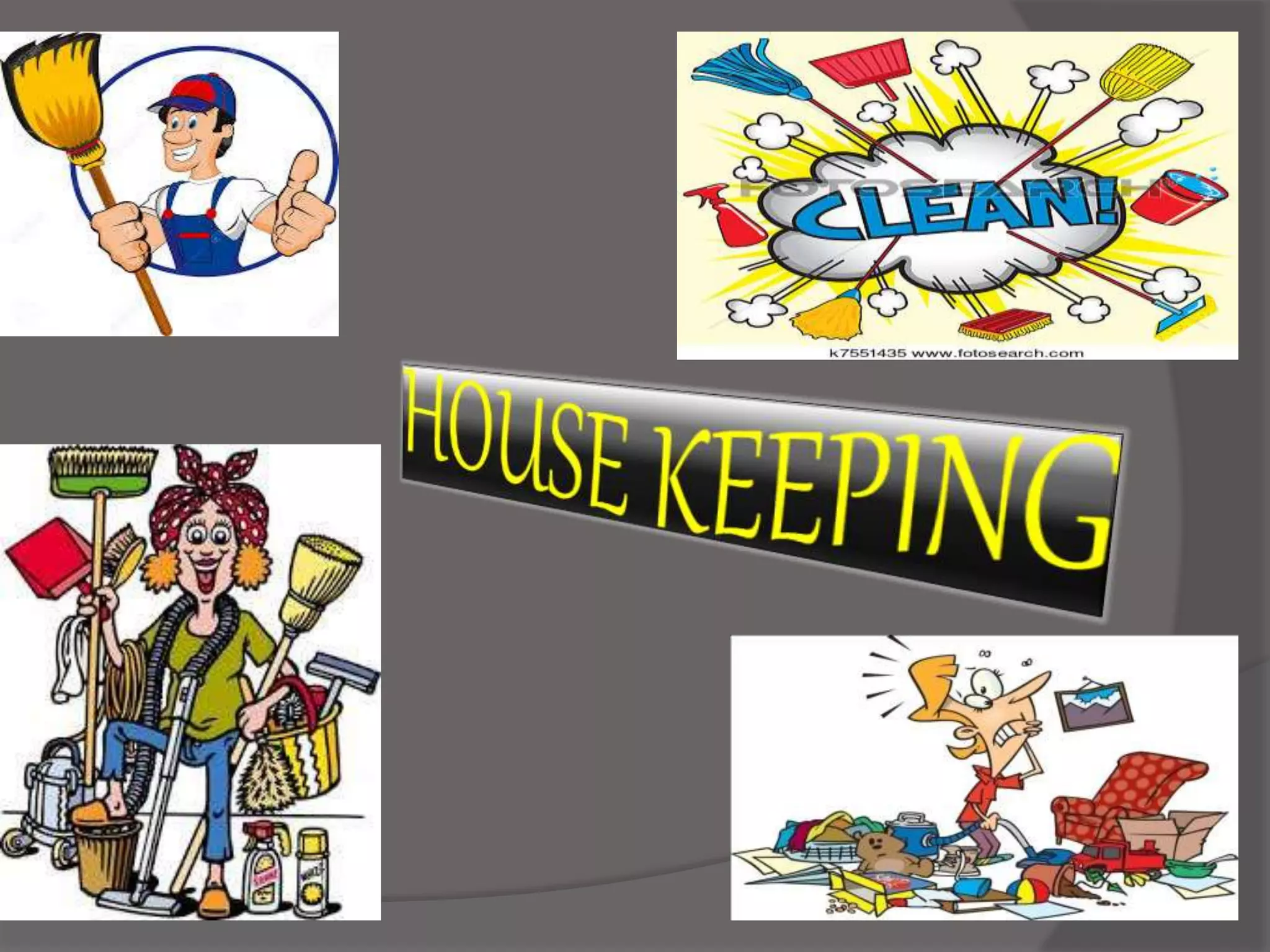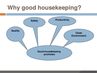 The document defines housekeeping and discusses its importance in both residential and commercial settings. It provides an overview of key housekeeping departments and functions, including guest rooms, public areas, the control desk, linen room, uniform room, laundry, and horticulture. It also describes common room types like single rooms, doubles, twins, suites, and executive rooms; and explains what guests expect from their rooms, such as comfort, security, privacy, convenience, and cleanliness.