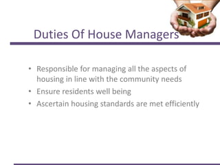 House managers are responsible for managing all aspects of housing to meet community needs, ensure resident well-being, and maintain housing standards. Their responsibilities include managing special projects, household security, events, staff, accounting tasks, and resident requirements. When handling difficult housing situations, house managers look for root causes, avoid pre-judgment, determine resident needs, act professionally, adapt their approach to the situation, and aim for a win-win resolution. Different types of house management jobs include managing multi-unit buildings, subdivisions, gated communities, and university housing.