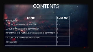 The document discusses the roles and sections of a hotel housekeeping department. It begins by stating that housekeeping is responsible for cleaning and maintenance of the entire hotel, including rooms, public areas, laundry, and decorations. It then lists the various roles of the housekeeping department, which include ensuring cleanliness, providing linens, uniforms and laundry services, floral decorations, and training and supervising staff. Finally, it notes that the housekeeping department aims to create a welcoming home away from home for guests through maintaining high cleanliness standards.