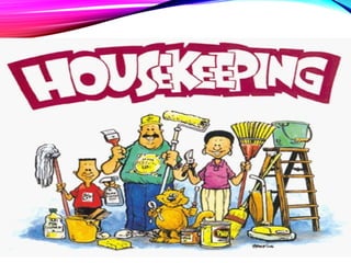 The document outlines the definition, scope, and responsibilities of housekeeping activities, emphasizing the importance of cleanliness, orderliness, sanitation, and safety in both domestic and institutional settings. It describes ideal housekeeping standards, various types of chores, and the significance of systematic cleaning practices known as 5S (Seiri, Seiton, Seiso, Seiketsu, Shitsuke) to enhance efficiency and maintain quality. Additionally, it provides guidance on planning and executing housekeeping tasks effectively.