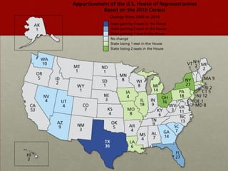 The House of Representatives has 435 members based on state population. To be a representative, one must be at least 25 years old, a US citizen for at least 7 years, and a resident of the state they represent. Representatives serve 2-year terms and are re-elected in November of even-numbered years. After each census, seats are reapportioned among states based on population changes, and districts are redrawn, which can result in gerrymandering that gives one party an unfair advantage.
