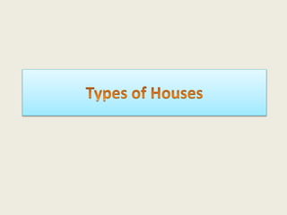 This document defines and describes different types of houses and residential buildings. It explains that a detached house is not joined to any other houses, while a semi-detached house is joined to another house on one side. A terrace house is part of a row of houses joined to two other houses, with end terrace houses located at each end. A bungalow is a one-floor house that may be joined to another or stand alone, and a cottage is a small house in the country.