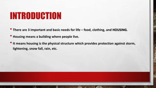 The document discusses the essential needs for life, focusing on housing as a protective structure influenced by factors like culture, income, and education. It highlights issues stemming from urbanization and industrialization, such as overcrowding and slum growth, which contribute to social problems. Additionally, it outlines various housing planning schemes aimed at improving living conditions for different income groups.