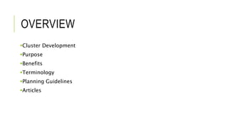 This document provides an overview of cluster development as an alternative to conventional subdivision development. It discusses how cluster development groups residential properties closer together to utilize the rest of the land for open space. The purposes of cluster development include creating more open space, encouraging integrated site design, and protecting environmentally sensitive areas. Benefits include more preserved land, better stormwater management, and making more ecological and economic sense compared to conventional subdivisions. The document defines various cluster development terminology and discusses planning guidelines and articles related to cluster development.