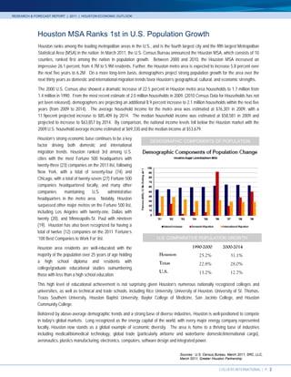 Houston's economy ranked among the top-performing US metros in early 2011. While Houston lost 95,200 jobs in 2009, it was the first year of job losses after strong growth from 2005-2008. Houston gained 13,100 jobs in 2010 and ranked #2 for new facilities that year. Population growth in the Houston metro area increased 26.1% from 2000-2010, making it the fastest growing metro in the US. With a diverse economy led by energy, trade, healthcare, and technology, Houston is well-positioned for continued growth.