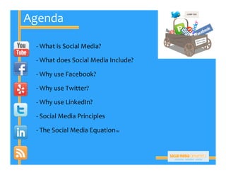 The document outlines a presentation about social media. It defines social media as online communities for sharing interests and discusses major platforms like Facebook, Twitter, and LinkedIn. Each platform is examined in terms of its users and benefits for communication and business. The presentation teaches social media principles like setting goals and guidelines and establishing an ideal ratio for informing, entertaining, and converting users. It encourages attendees to learn more at the speaker's company website.