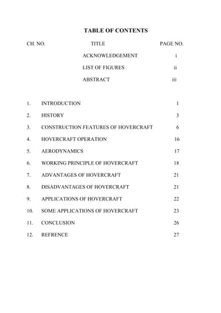 This document is a seminar report on hovercraft submitted by Nipranch Shah to the Department of Mechanical Engineering at Sir Padampat Singhania University in Udaipur, India in May 2014. The report provides an overview of hovercraft, including their history, construction features, operation, aerodynamics, working principle, advantages, disadvantages, and applications. It discusses key components like the lifting fan, thrust propellers, momentum curtain, and flexible skirt. The report also outlines some specific hovercraft applications like lifeboats, passenger transport, racing, and military uses.